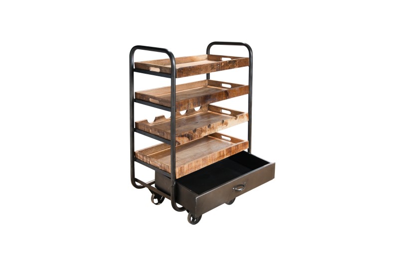 Dat is nog eens opruimen! Alles krijgt een plaatsje in deze handige keukentrolley. Zelfs aan de wijnflessen is gedacht. De Cozy-trolley is uitgevoerd in stevig staal met massief acaciahout. De handige lade en de leuke wieltjes geven het ontwerp iets aparts en unieks. Deze trolley en nog veel meer varianten vind je in onze woonwinkel of in de webshop. Shop ook voor Cozy magazineholders en decoratieve schapenvachten.