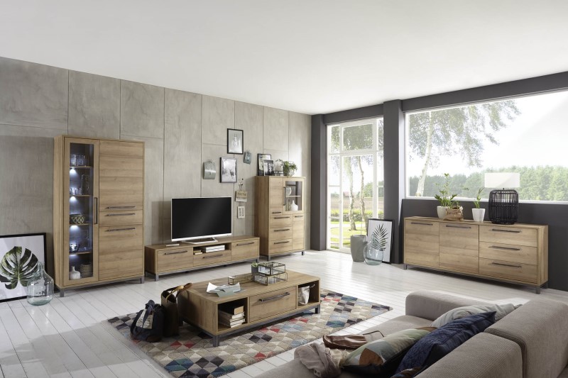 Succes verzekerd met woonkamer Beverly Hills. Want dit is een moderne industriële woonkamer met heel veel mooie details. Hij is uitgevoerd in de warme kleur Riviera-eiken-decor, en is voorzien van industrie staal decor onderstellen. De robuuste handgrepen zijn van echt staal. Wij vinden de salontafel van deze woonkamer erg mooi. Het is een salonbox omdat hij, net als het tv-meubel, een lade heeft en open vakken. Dit is enorm praktisch voor het opbergen van je altijd rondslingerende afstandsbedieningen, controllers en onderzettertjes. En nog steeds betaal je voor deze prachtige en complete meubelset maar €899,00.