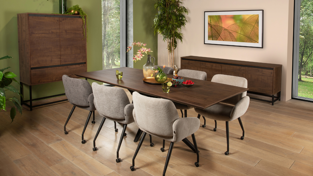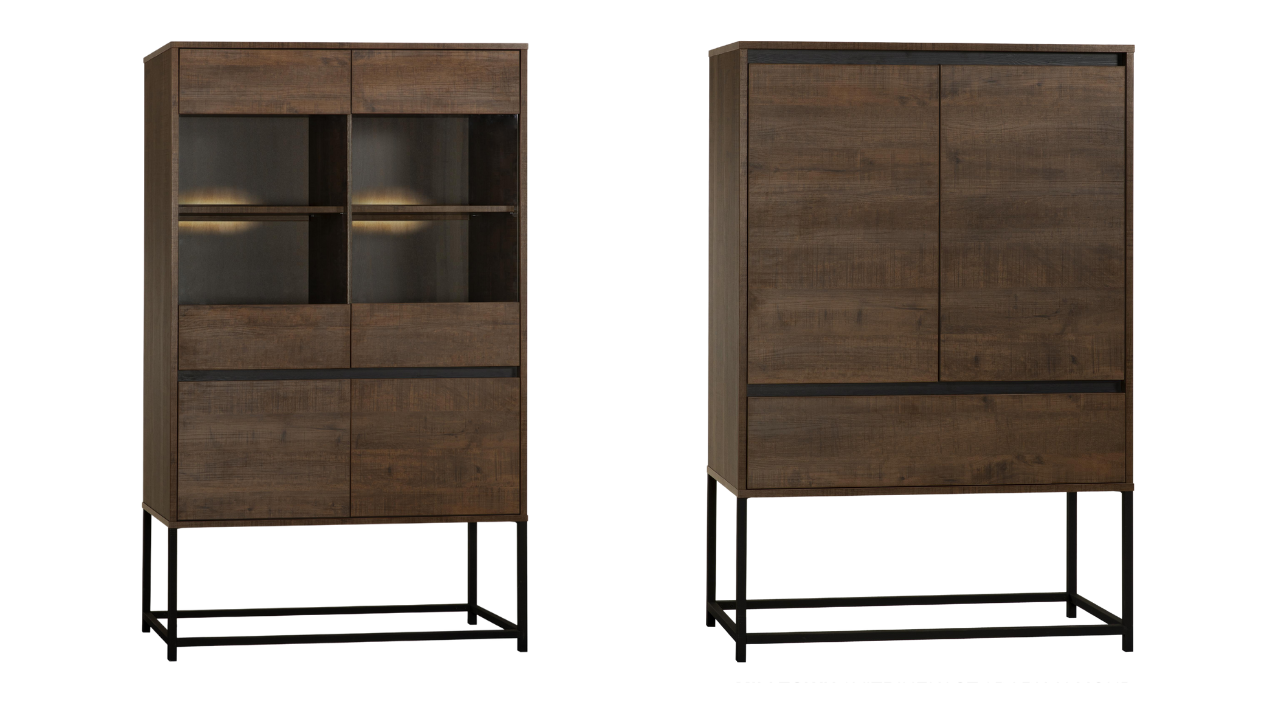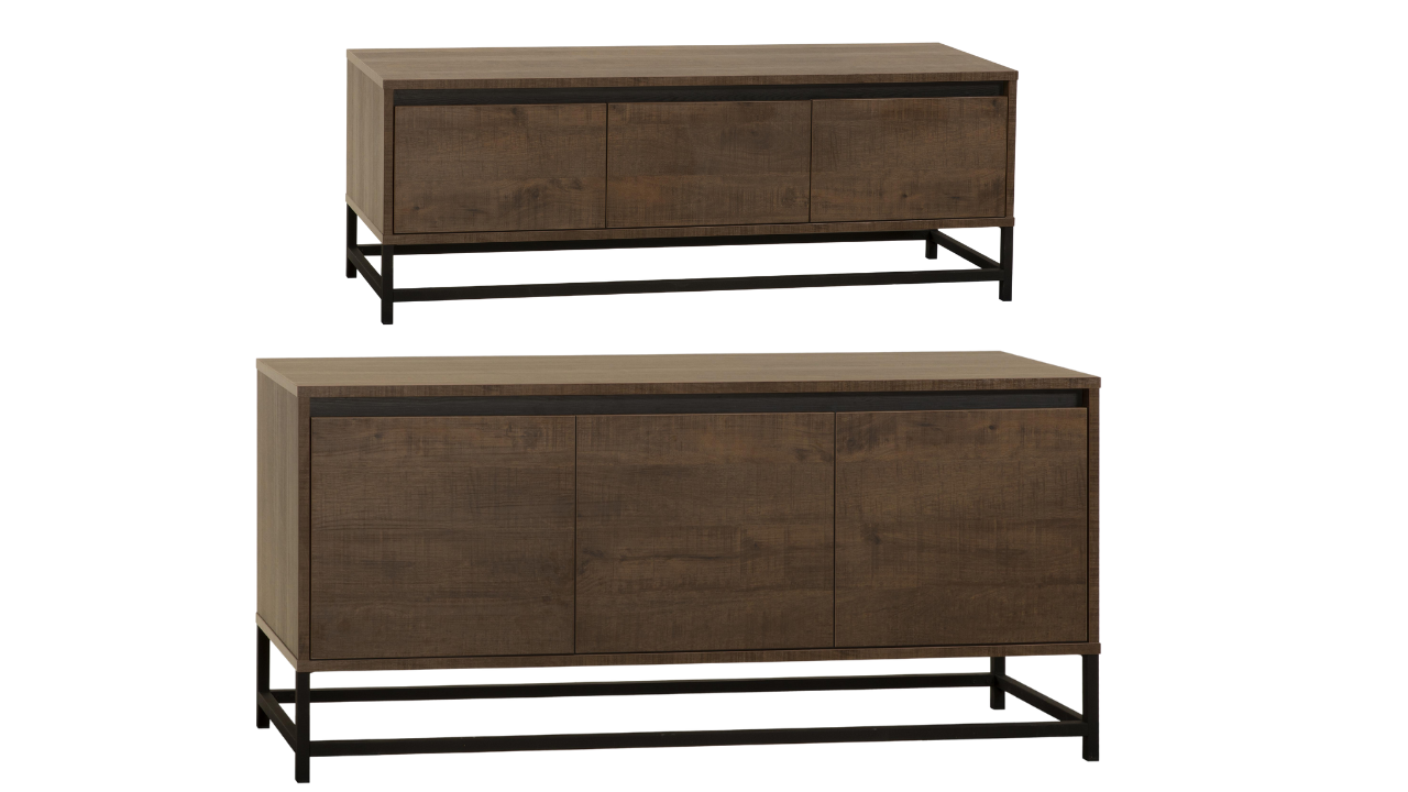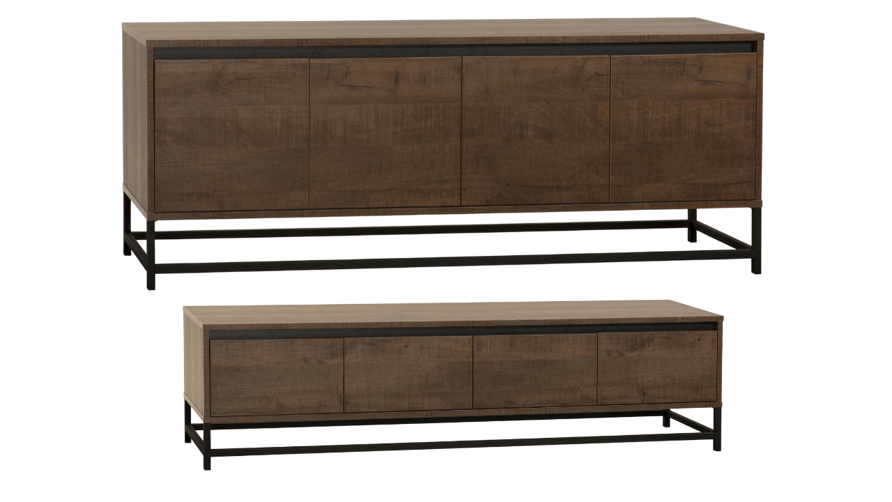 De Woonkamer set Millewakie in dark mango decor brengt warmte en moderne elegantie samen met een strak zwart stalen frame. De set, met greeploze deuren en lades, biedt een stijlvolle opbergoplossing met een minimalistische uitstraling. Perfect voor wie een harmonieus en functioneel interieur wil creëren.